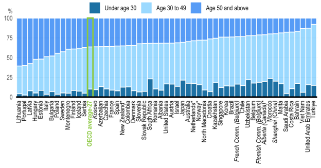 The teaching profession in South Africa remains satisfactory and stable, with a younger cohort of teachers compared to other global systems, according to TALIS. The average age of South African teachers decreased from 43 years to 41 years between 2018 and 2024. This compares to the OECD average age of 45 years old. According to TALIS, the South African schooling system has made inroads in terms of attracting youth into teaching, with the highest percentage of teachers under the age of 30 years (see figure below).