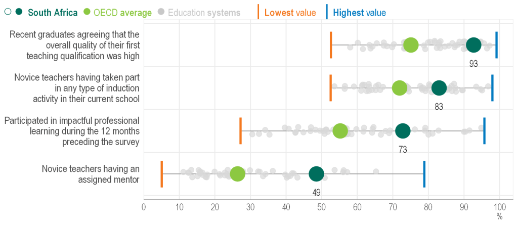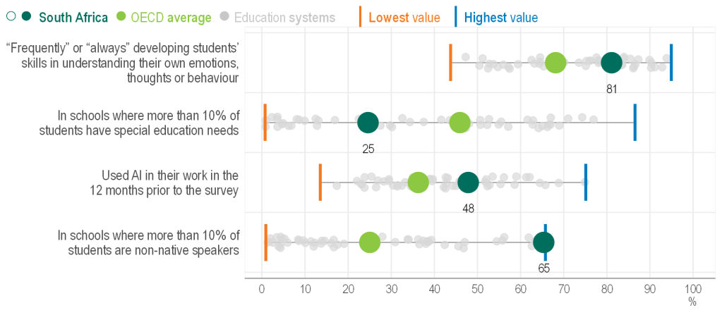 The OECD’s Director for Education and Skills Andreas Schleicher pointed out that teacher training gaps do persist, partly due to the changing demands of the profession. Only two-thirds of primary teachers in Sub-Saharan Africa meet national standards, he said. According to TALIS, teachers in South Africa require more skills to teach students with special education needs or whose home language is different to the language of instruction; as well as training for using artificial intelligence for teaching and learning.