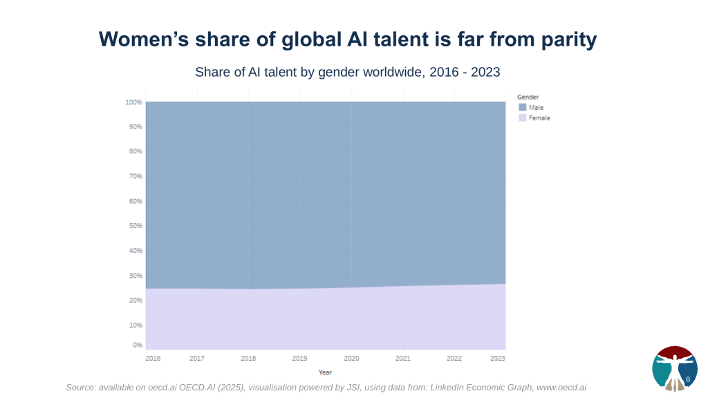 Celine Caira, Economist & Policy Analyst at the AI Unit of the OECD Science, Technology and Innovation (STI) Division, opened the webinar with a compelling overview of AI and gender dynamics drawn from the OECD.AI Policy Observatory. While women’s participation in AI has grown globally, progress is slow: as of 2023, women made up less than 30% of global AI talent. The gap varies across sectors and countries, with some industries—such as manufacturing and IT—remaining male-dominated. And although women are contributing more to AI research, their presence in STEM careers continues to lag. These numbers underscore why inclusive AI education and training must begin early and extend across the career lifecycle.
