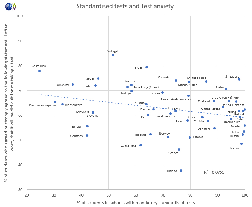 Interestingly, a look across countries does not show any relationship between the share of students in schools with mandatory standardised tests and the share of students who say they often worry that it will be difficult for them taking a test.
