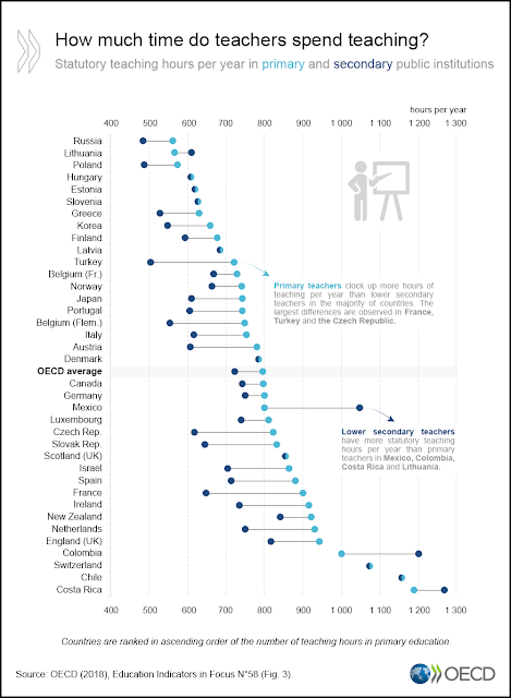 Learning needs vary as we evolve through life. The early years of education set the stage for children’s well-being, cognitive and social-emotional development; young children starting out in the world require stability, reassurance, and encouragement, and need a warm and caring teacher. At primary school, teachers manage the class, teach all subjects, and help children develop not only basic competencies, but also emotional and social awareness. While this setting still requires a broad knowledge of many subjects, dealing directly with students’ social and emotional development also helps teachers bond with their class, which is essential to learning at such a young age. However, as children progress to high school, learning becomes more about the subject: secondary teachers focus on one or several subjects which they teach to a number of different classes. Their performance will be more strongly evaluated by how well their students perform on these subjects, rather than on how their students develop emotionally and socially. Other differences exist between the two levels of education. While the entire profession is generally plagued with an ageing workforce, secondary schools are particularly affected by the rising average age of teachers. On the other hand, while it is true that men have always been outnumbered by women in teaching, this trend is much more striking at primary than at secondary level. Both trends have worsened in the past ten years and do not show signs of slowing down. In spite of these differences between teachers at different education levels, teaching policy is all too often determined by a “one size fits all” approach. This month’s Education Indicators in Focus examines exactly in which ways primary and lower secondary teachers differ across a range of system-level indicators and why it matters, not only for the quality of teaching in the classroom, but also for the attractiveness of teaching as a profession. Certification is not everything, and teaching quality stems from much more than the way teachers deliver lessons. It is also strongly affected by their working conditions. Both primary and secondary teachers work approximately the same number of statutory hours, but they allocate their time differently. The figure above shows that lower secondary teachers spend on average 10% less time teaching than their primary colleagues, though in countries such as France and Turkey, this can reach 30% less. The time actually spent teaching matters less if teachers are well trained and deliver effective classes; however, with the long hours required, at school and at home, teachers are finding less and less time to invest in their own continuous development and other activities that would benefit learning. Finally, the perception of a fair salary can be pivotal in attracting and retaining teachers. While primary and lower secondary teacher salaries are comparable, secondary teachers hold an edge in more than half of OECD countries. In contrast to many other professions, those with a higher degree are not necessarily paid more: teachers in Finland hold a master’s degree, but earn less in relative terms than Korean teachers with a bachelor’s degree. A fairer compensation compared to other tertiary-educated workers would help attract a more gender balanced workforce and attract new talent that would renew the profession with innovative ideas. Policy decisions to improve the attractiveness and effectiveness of the teaching profession will always involve a trade-off between these different factors. Although many efforts have traditionally focused on reducing the size of classes, usually a popular measure for the broad public, nothing works more to enhance the quality of learning than the teachers themselves. However, striving for higher quality is not likely to be the result of one policy change or reform, but requires an understanding of all the factors that affect the profession holistically, from teacher training to long-term support, to actual teaching conditions, including working hours and pay. Recognizing the specific working conditions of primary and secondary teachers would lead to a more targeted policy response. Teachers at each level face different challenges. Let’s not assume they have the same solution. Read moreEducation Indicators in Focus No. 58 – How do primary and secondary teachers compare?